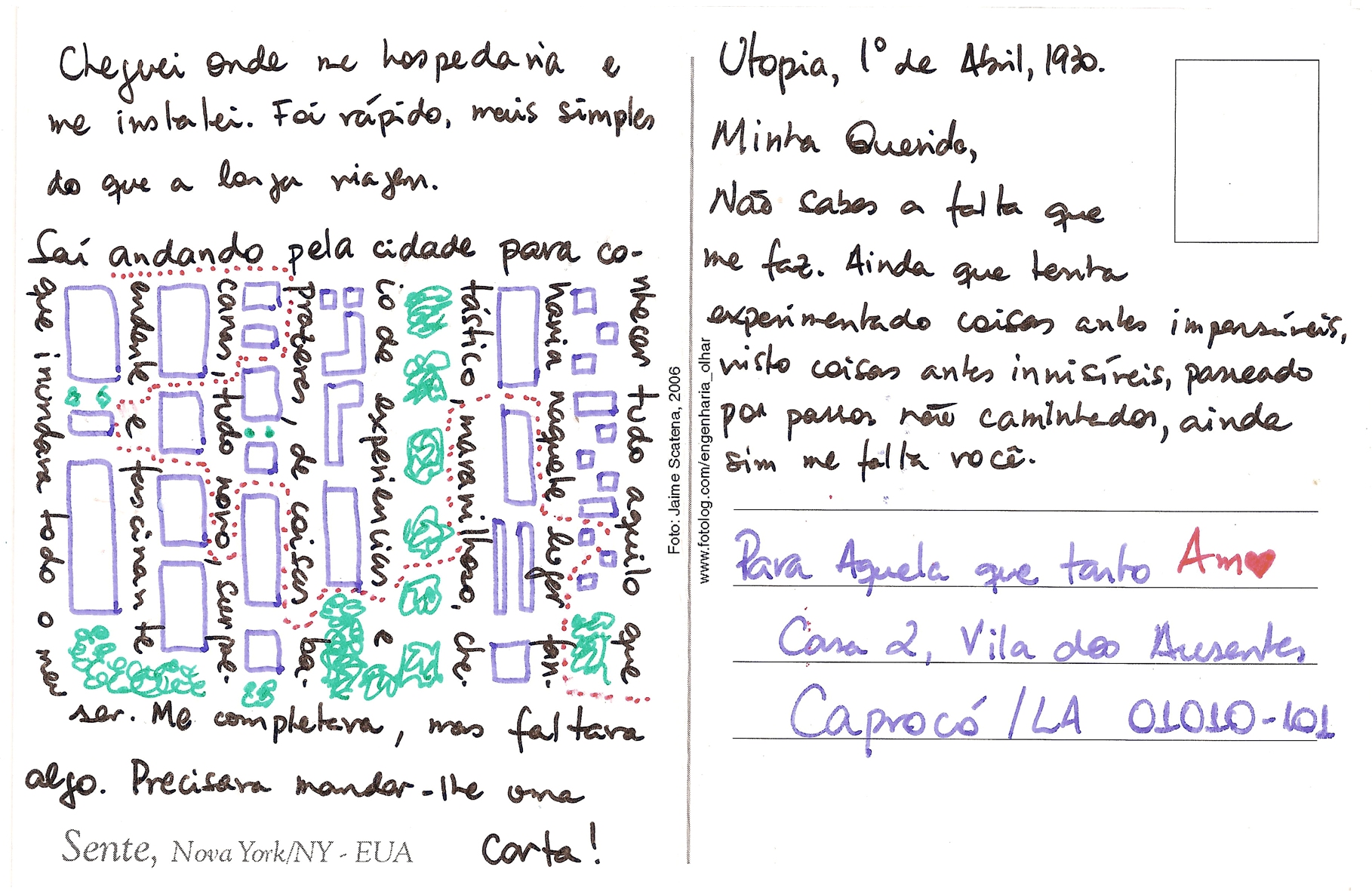 Saí andando pela cidade para conhecer tudo aquilo que havua naquele lugar fantástico, maravilhoso, cheio de experiênicas e prazeres, de coisas bacanas, tudo novo, surpreendente e fascinante que inundava todo o meu ser. Me completava, mas faltava algo. Precisava mandar-lhe uma carta!